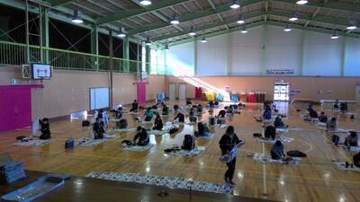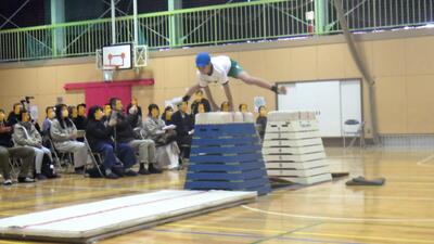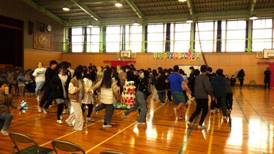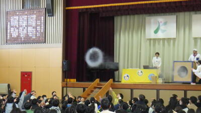 なんと、空気の玉がだんだんと渦をまいた円になりました!ビニールテープを空気砲に入れて一緒に売ったので、空気が渦を巻いて動いている様子が目で見て分かりました!体育館の一番後ろまで届いていました!
