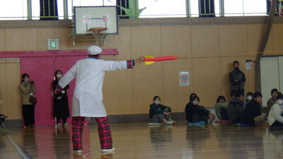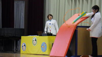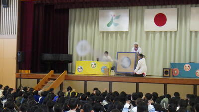 今日はPTA主催のサイエンスショーがありました!チャーリー西村さんとアシスタントの2名の方が北小に来てくださり、4つの実験を見せてくれました。
