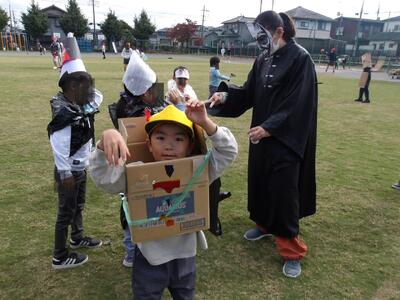手作りのコスチュームを見せてくれる子もいました。話を聞くと「このお面の包帯とばんそうこうは本物を使ったんだよ。家の人とアイディアを出して作ったんだ!」と嬉しそうに話してくれました。