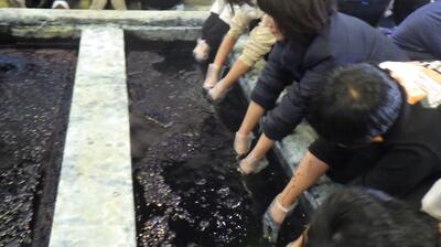 輪ゴムでしぼったハンカチを、染液に浸します。みんな懸命に体験に取り組んでいました。