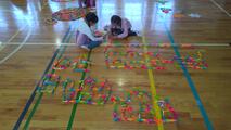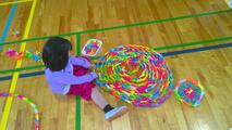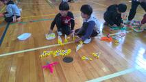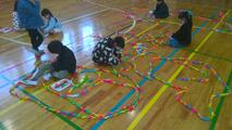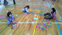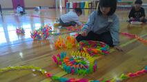 一人で集中する子、友達とつなげる長さを競争する子、つなげたり立体的にしたり、思い思いに楽しんでいました。子どもたちの自由な発想は、天才的です。あっという間に時間が過ぎてしまいました。最後には、自分と友だちの作品を写真におさめたり、高い場所から全体を見たりもしました。教室ではできない、特別な体験。また一つ、素敵な思い出ができました。