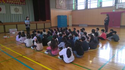 埼玉県立近代美術館の先生に来ていただき、特別授業をしていただきました。約2万個のカラフルな洗濯ばさみを使って、体育館いっぱいに自由に作品作りをしました。